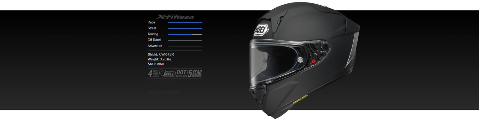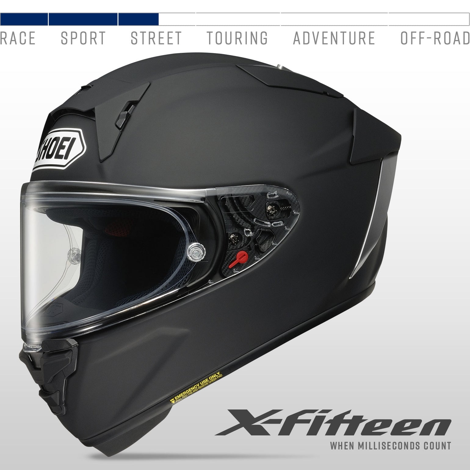 For when milliseconds count. Experience the fusion of premium protection and sophistication with the SHOEI X-Fifteen helmet in solid and special edition colors, engineered to deliver unparalleled safety, comfort, and performance for riders.