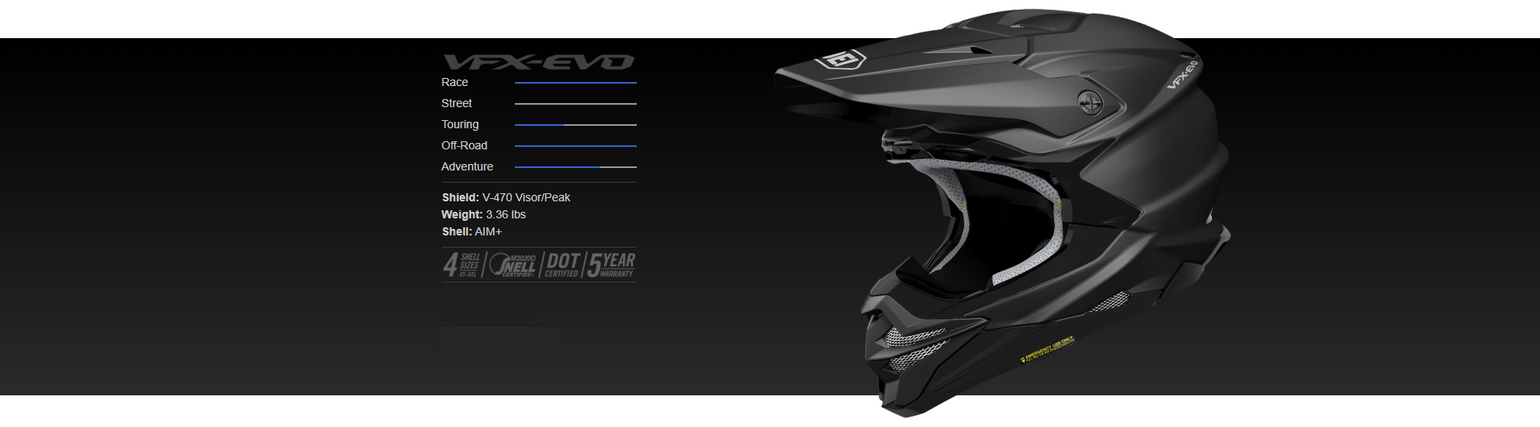 Completely reimagined and re-engineered without sacrificing an ounce of the quality and performance that have given SHOEI motocross and off-road riders championship-worthy confidence for nearly a decade, the VFX-EVO defines the future of performance. The SHOEI VFX-EVO helmet is a top-of-the-line dirt bike helmet, meticulously designed for off-road enthusiasts who demand the utmost in safety, comfort, and performance.
