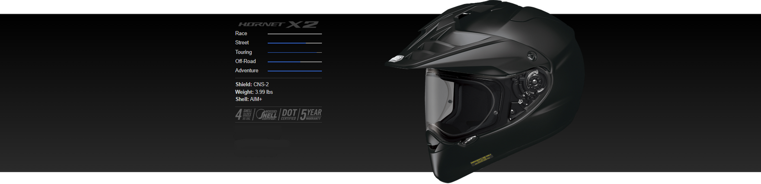 Striking the optimal balance between on-and-off-road form and function, the Hornet X2 offers serious dual-sport enthusiasts the perfect helmet for all corners of their journey. The SHOEI Hornet X2 helmet is the ultimate adventure touring helmet designed to meet the needs of riders who embrace both on-road and off-road adventures.