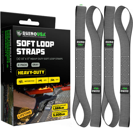 The Rhino USA Soft Loop Tie Down Straps feature a soft loop design that ensures a secure and gentle grip on your cargo. The soft loop prevents any scratching or damage to delicate surfaces, making it perfect for securing motorcycles, ATVs, or other items with sensitive finishes. Our soft loop tie downs include four - 1.7” x 17” soft loops, that can be used for create tie down points in tight spots where hooks can't fit, and can also be used along with our HD Ratchet Straps.
