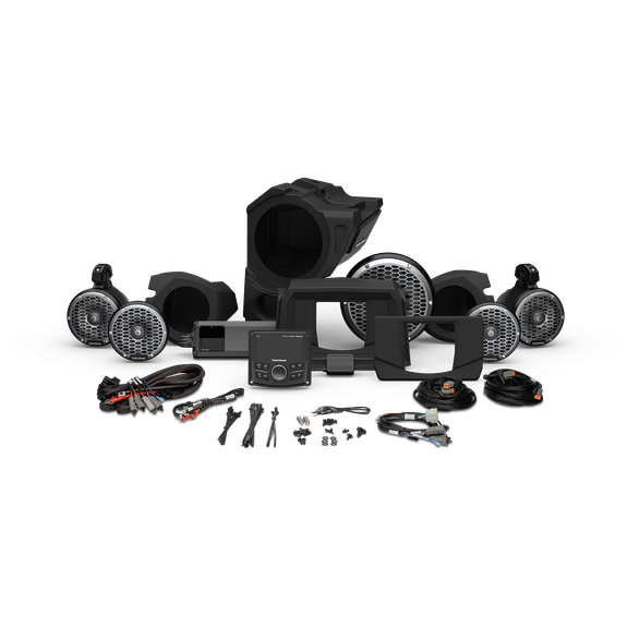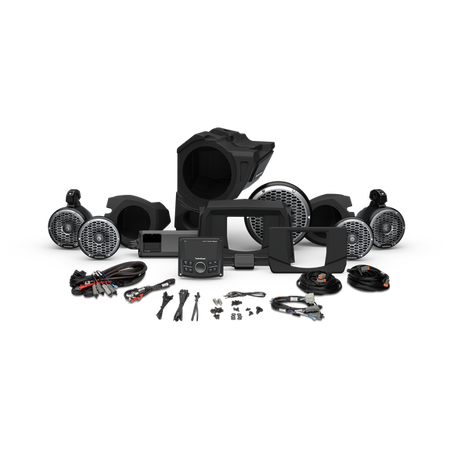 Our Gen-3 Stage 5 lets you hit the dunes and trails and be the center of attention. System allows you to add front and rear Color Optix™ speakers and a subwoofer on select RZR models. Kit is equipped with a PMX-3 digital media receiver with camera video input and SiriusXM Ready® for satellite radio, upper/lower dash kit (installation location depends on RZR model,) front speaker enclosures, M2 6.5" Color Optix™ speakers, 1,500-watt Element Ready™ amplifier, front subwoofer enclosure, M2 10" Color Optix™ subwoofer, 4-gauge wiring harness, M2 6.5" Color Optix™ moto-cans with harness, and a Color Optix™ controller. Kit supplied with all necessary mounting and installation hardware requiring minimal time and tools. Refer to our COMPATIBILITY chart to verify fitment before purchasing.
