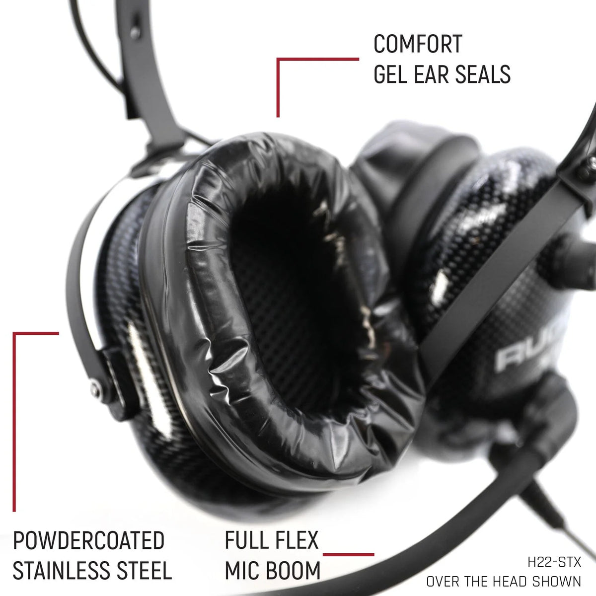 Choose between Over-the-Head (H22) or Behind-the-Head (H42) configurations, both built with carbon fiber styling, plush gel ear seals, and breathable cloth covers for unmatched comfort during long rides. Integrated volume control and a hard-wired coil cord keep you in command and connected.
